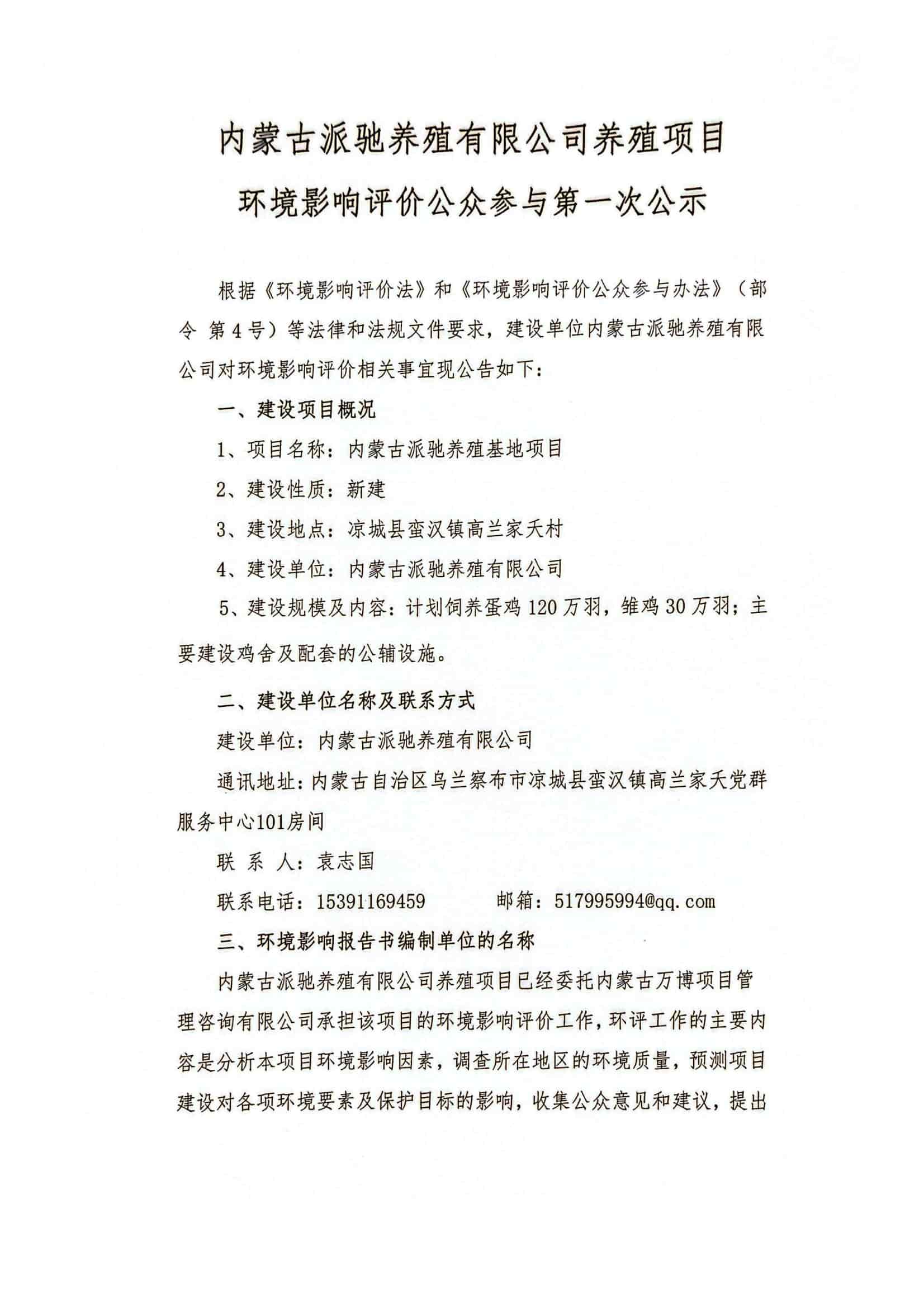 內(nèi)蒙古派馳養(yǎng)殖有限公司養(yǎng)殖項目環(huán)境影響評價公眾參與第一次公示